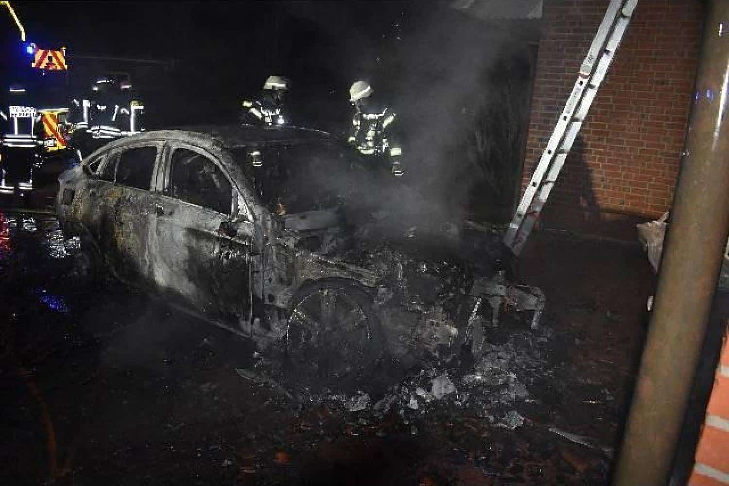 Bei Eintreffen der Einsatzkräfte stand der graue Mercedes bereits in Vollbrand vor einer Doppelgarage. Die Flammen griffen auf Teile der Garage über und verursachten Schäden am Mauerwerk, am Tor und im Dachstuhl.