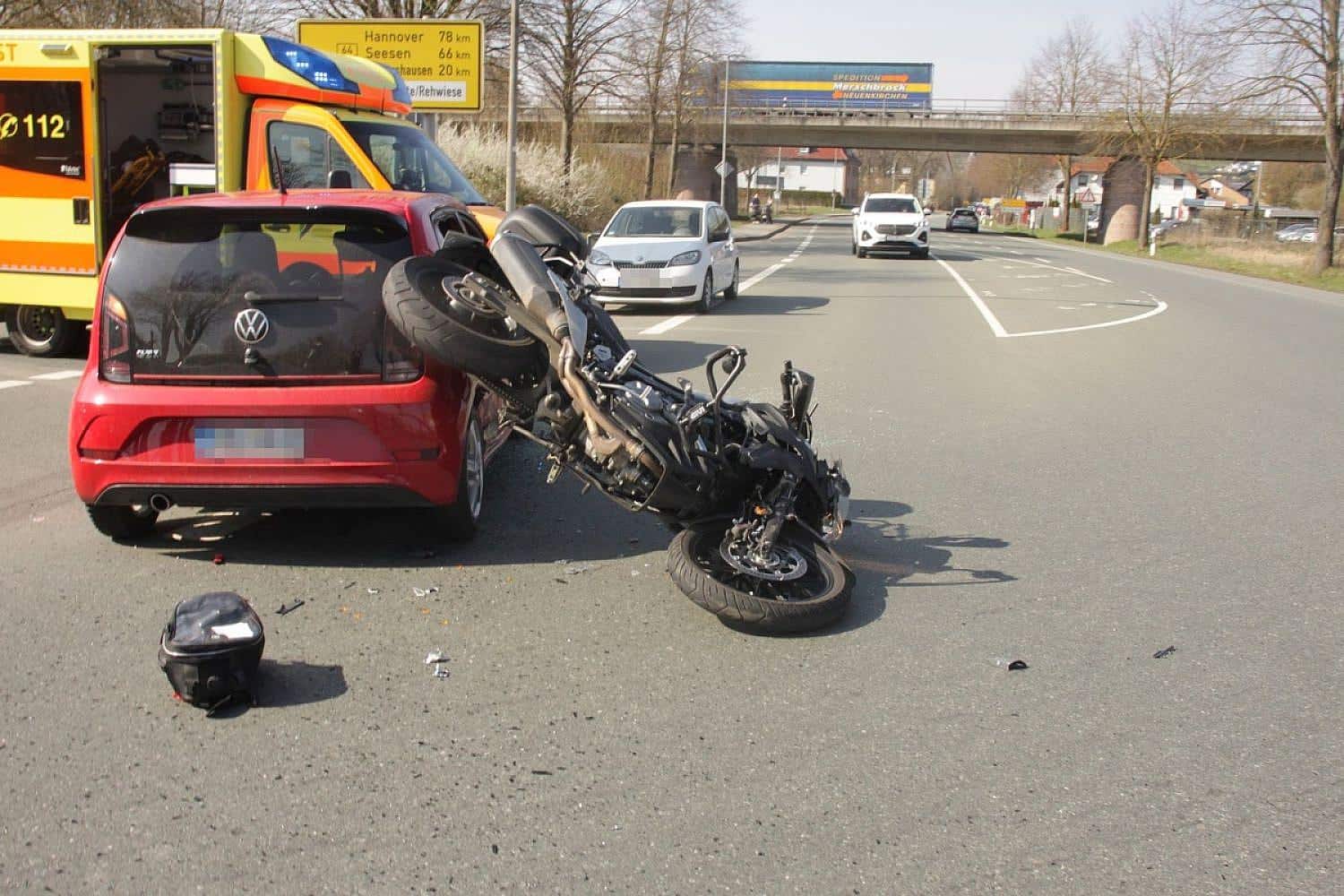 Der Unfall ereignete sich am Montag gegen 13:15 Uhr auf der B83. Ein 18-jähriger Fahrer eines roten VW Up übersah den aus Richtung Stahle kommenden Motorradfahrer, als er nach links auf den Auffahrtsarm zur B64 abbiegen wollte. Es kam zum Zusammenstoß.