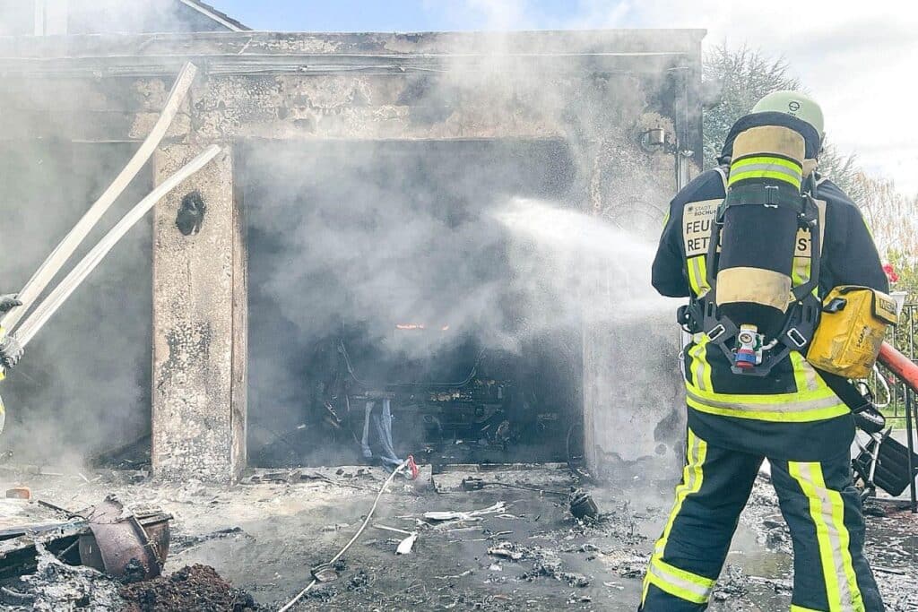 In der brennenden Garage standen zwei Pkw und mehrere Gasflaschen, die unmittelbar vom Feuer betroffen waren. Fünf Atemschutztrupps gingen sowohl von innen als auch von außen gegen die Flammen vor.