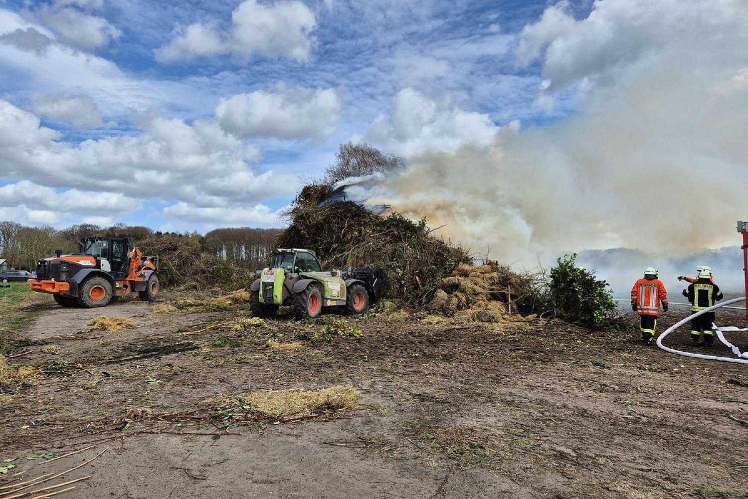 Mit Hilfe eines Radladers konnten noch nicht brennende Teile des Haufens abgetragen werden, um größeren Schaden zu vermeiden. Ein Teil des Feuers musste kontrolliert abbrennen, wozu eine Brandwache vor Ort blieb.