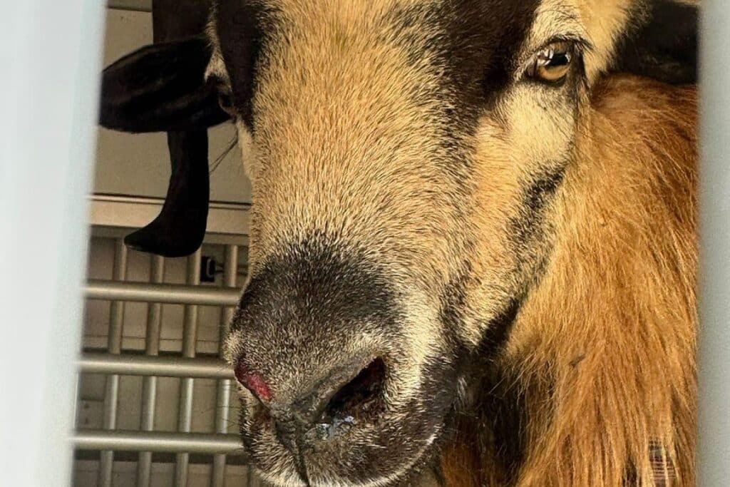 Gegen 16:00 Uhr war der Notruf über den herrenlosen Westafrikanischen Zwergschafbock eingegangen. Die Einsatzkräfte konnten das Tier nach einer kurzen Verfolgung einfangen.