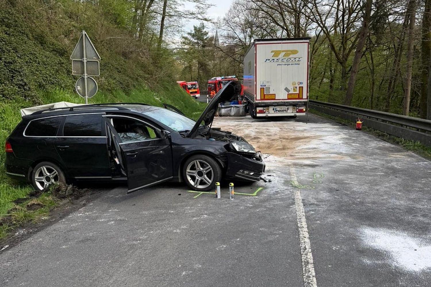 Neustadt () – Bei einem Zusammenstoß zwischen einem Lkw und einem Pkw mit Anhänger auf der L255 zwischen Neustadt und Etscheid ist am Freitagnachmittag ein Mensch schwer verletzt worden. Zudem liefen größere Mengen Diesel aus, wie die Feuerwehr der Verbandsgemeinde Asbach mitteilte.