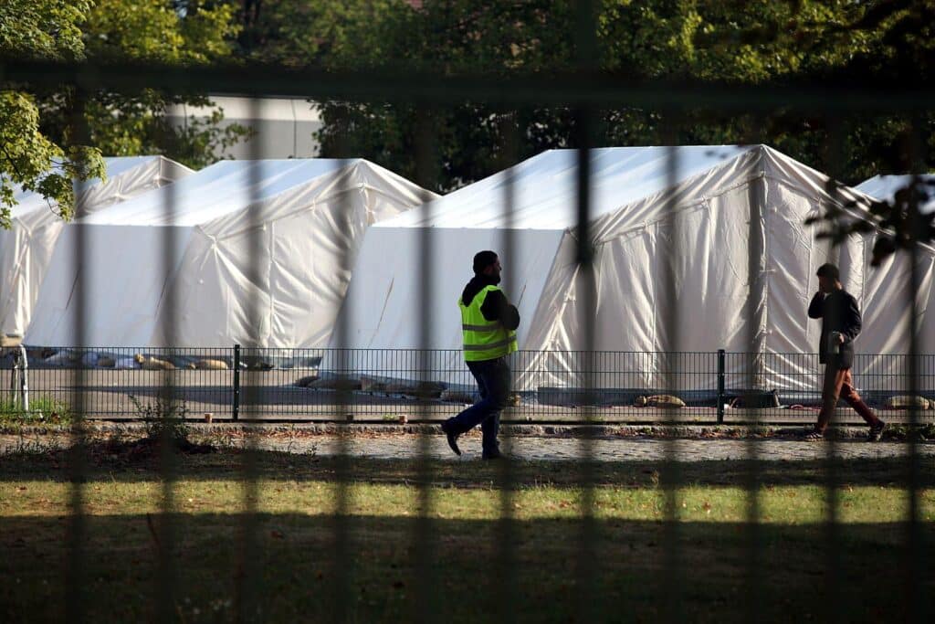 | Bildhinweis: | Flüchtling und Sicherheitsmann in einer „Zeltstadt“ (Archiv) |