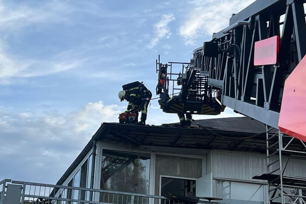 Einsatzkräfte leiteten umgehend die Brandbekämpfung ein, wobei ein Trupp im Gebäudeinneren und ein weiterer über die Drehleiter zur Öffnung der Dachhaut vorging.