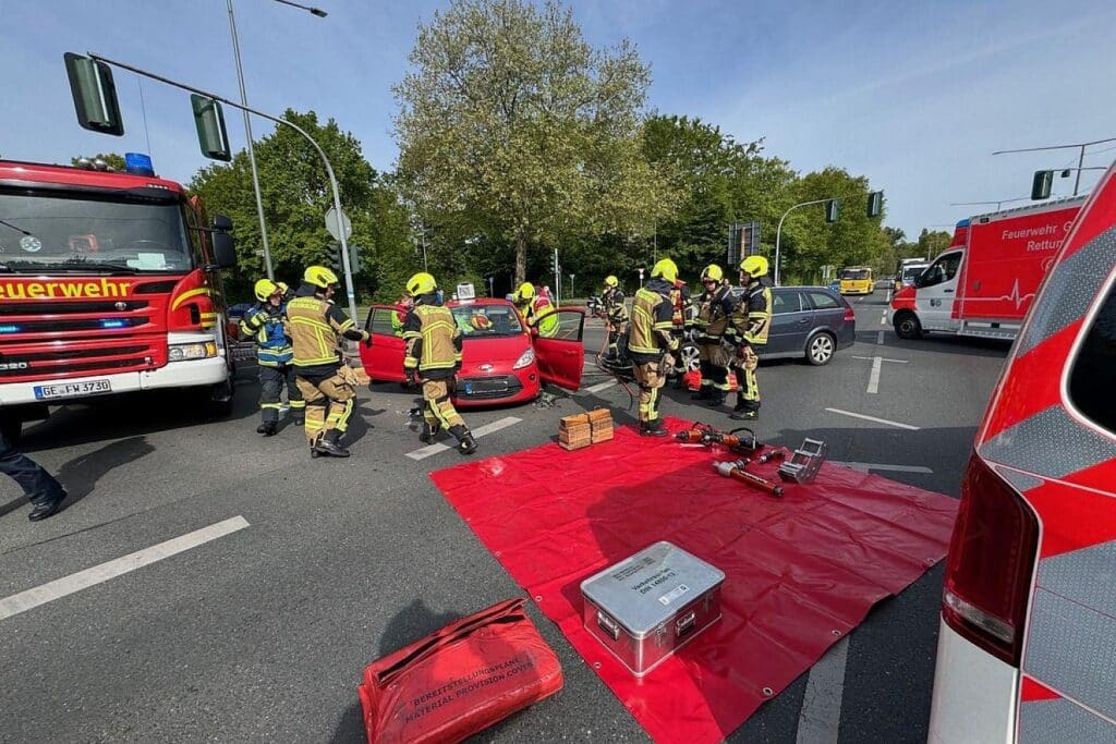 Gelsenkirchen () – Bei einem Verkehrsunfall im Kreuzungsbereich der Willy-Brandt-Allee und der Münsterstraße in Gelsenkirchen-Erle sind am Montagvormittag zwei Personen verletzt worden. Die Feuerwehr teilte mit, dass sie gegen 10:20 Uhr alarmiert wurde, nachdem zwei Pkw zusammengestoßen waren.