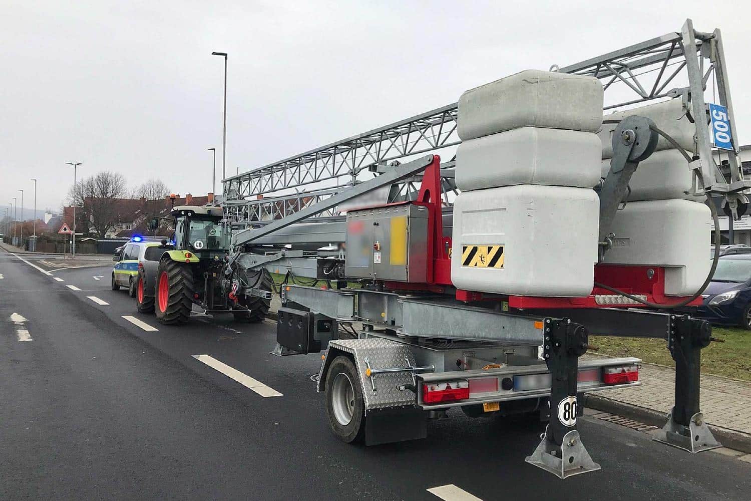 - Traktor mit schwerem Turmdrehkran gestoppt.