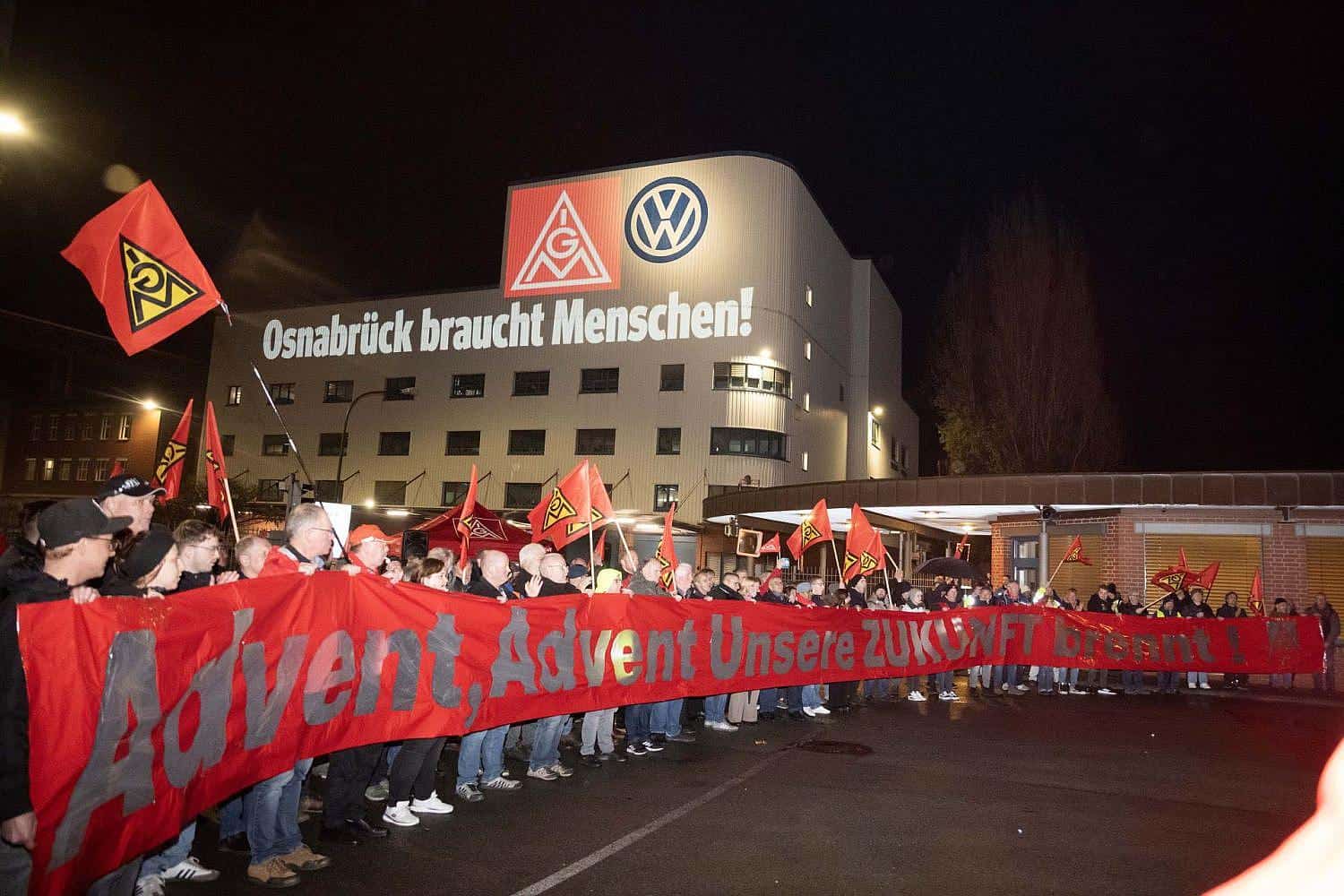 Das Motto der Aktion lautete: „Advent, Advent – die Zukunft brennt!“. Die IG Metall erinnerte in ihrer Ansprache an die schwierigen Tarifverhandlungen des vergangenen Jahres und betonte, dass es gelungen sei, die Produktion des T-Roc Cabriolets am Standort Osnabrück fortzuführen.