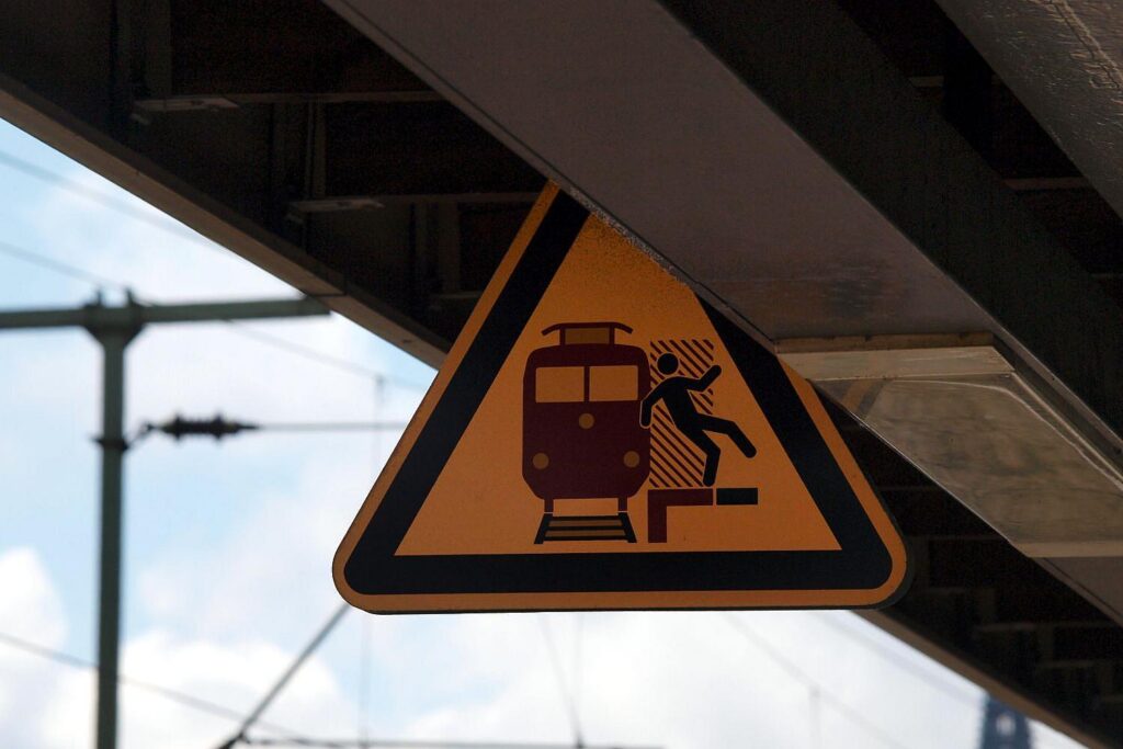 Bildhinweis: Warnschild am Bahnhof