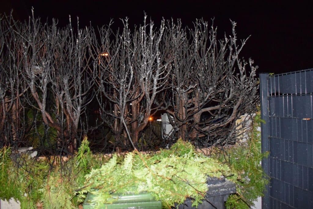 Eine hohe Zierhecke und ein Zaun gerieten dabei in Flammen.