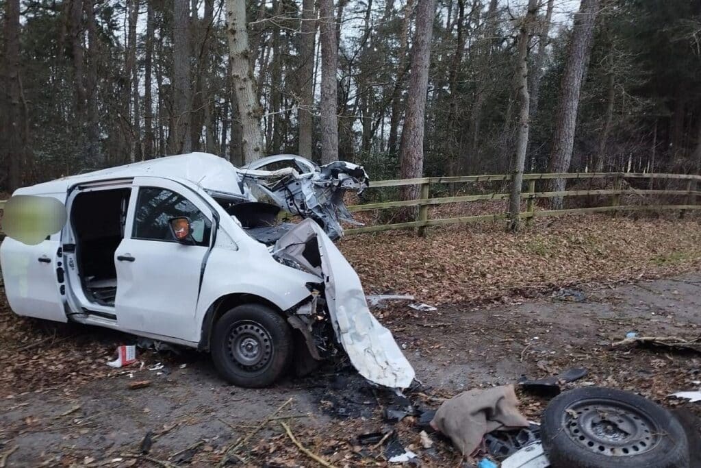 Ein Kleinlieferwagen (Mercedes Citan) war aus bislang ungeklärter Ursache von der Fahrbahn abgekommen und frontal gegen einen Baum geprallt. Den Einsatzkräften bot sich ein großes Trümmerfeld.