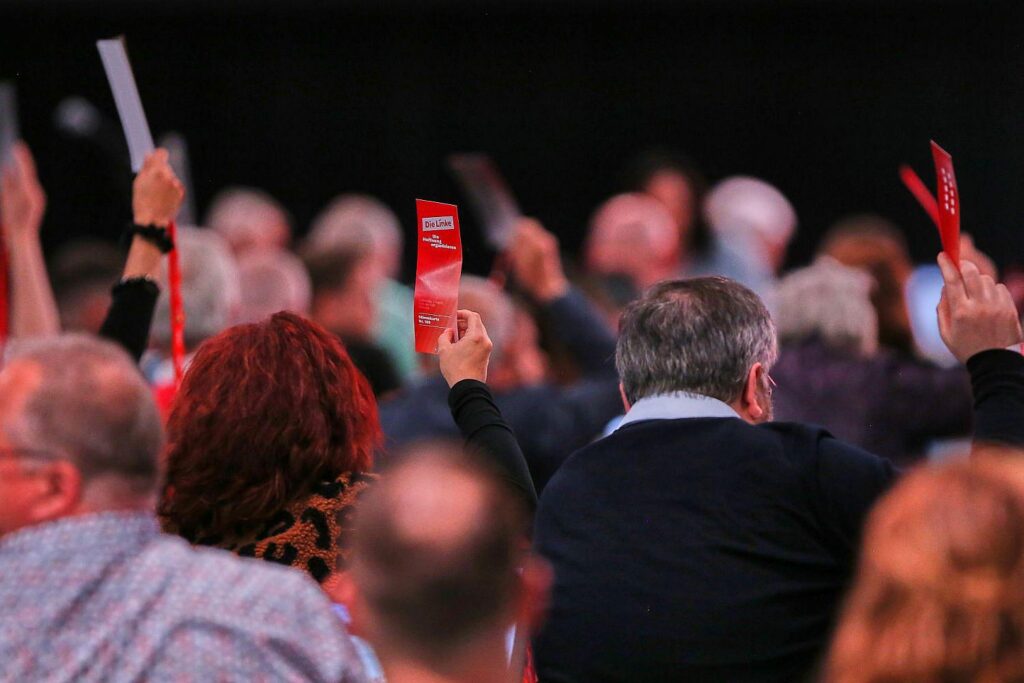 | Bildhinweis: | Abtsimmung auf Linken-Parteitag |