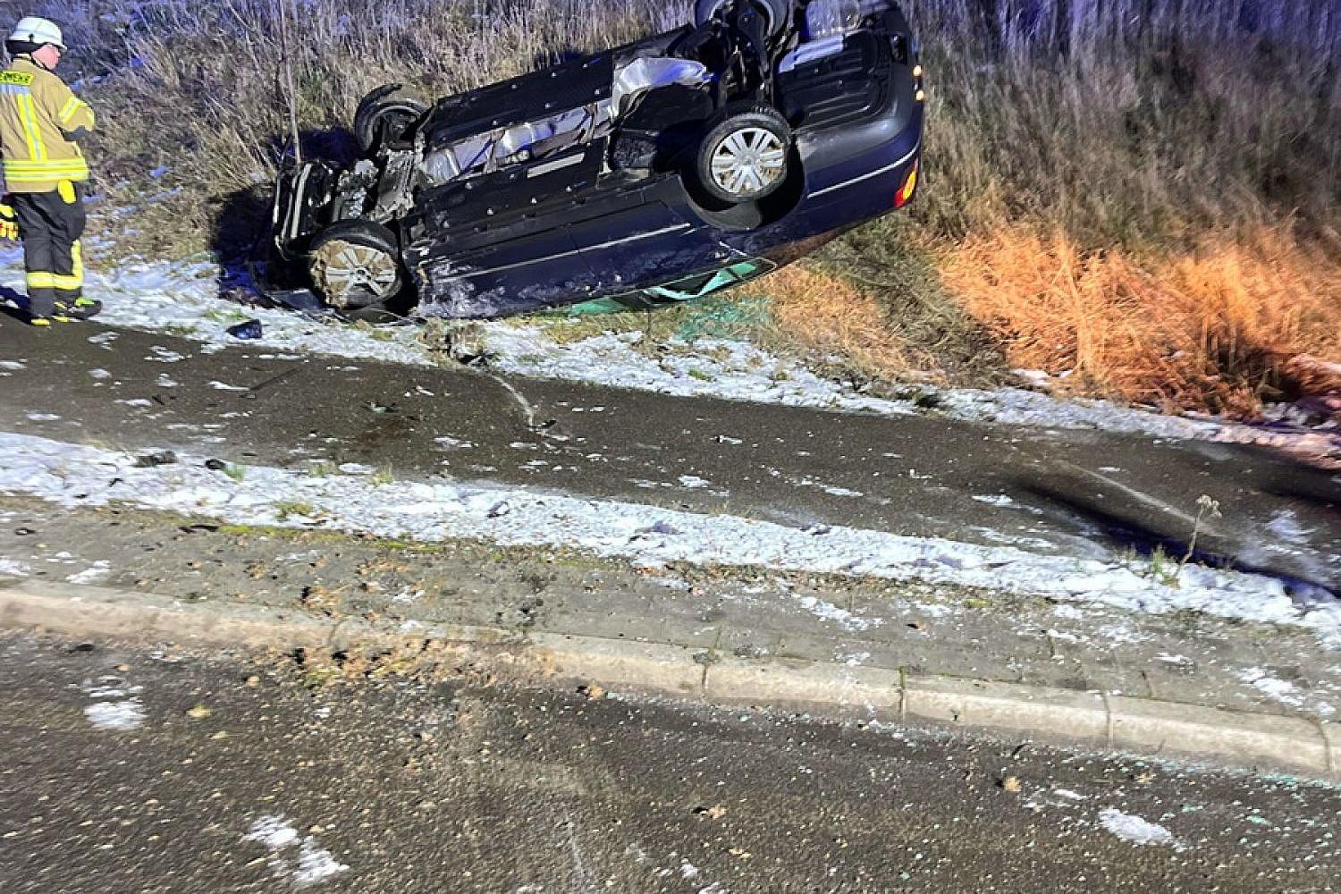Er überquerte die Grünfläche in der Mitte, woraufhin sich sein Auto überschlug und auf dem Dach neben der Fahrbahn liegen blieb. Der Fahrer konnte sich selbst befreien.