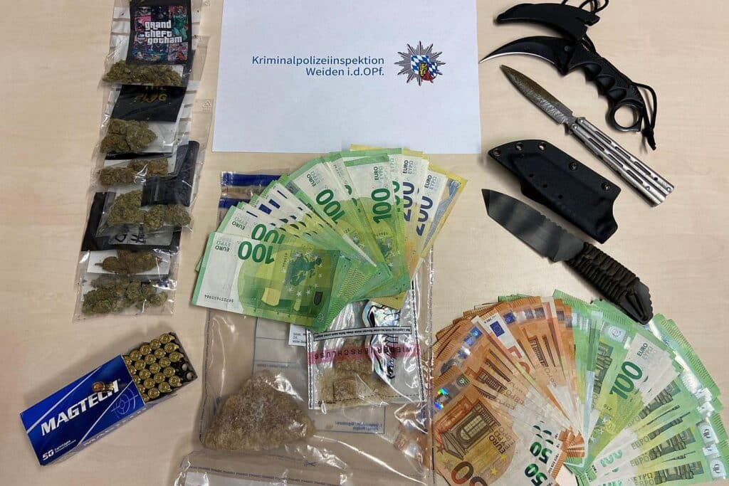 Die Ermittler der Kriminalpolizeiinspektion Weiden identifizierten den 23-jährigen Deutschen als mutmaßlichen Lieferanten. Bei der Durchsuchung seiner Wohnung fanden die Beamten nach Angaben der Polizei knapp über 250 Gramm Marihuana, mehr als 300 Gramm Haschisch, über 150 Gramm MDMA, eine geringe Menge Ecstasy, drei verbotene Messer sowie eine zweistellige Anzahl scharfer Patronen.