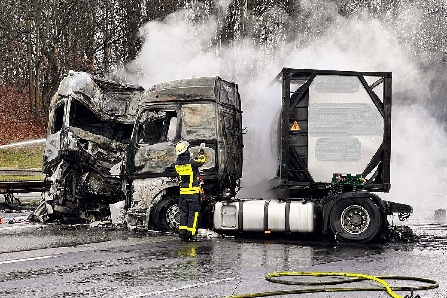 Der Unfall löste einen Großbrand aus, der bis in die Abendstunden hinein bekämpft werden musste. Während der Fahrer eines LKW leicht verletzt ins Krankenhaus gebracht wurde, kam für den anderen jede Hilfe zu spät; er verstarb noch an der Unfallstelle.