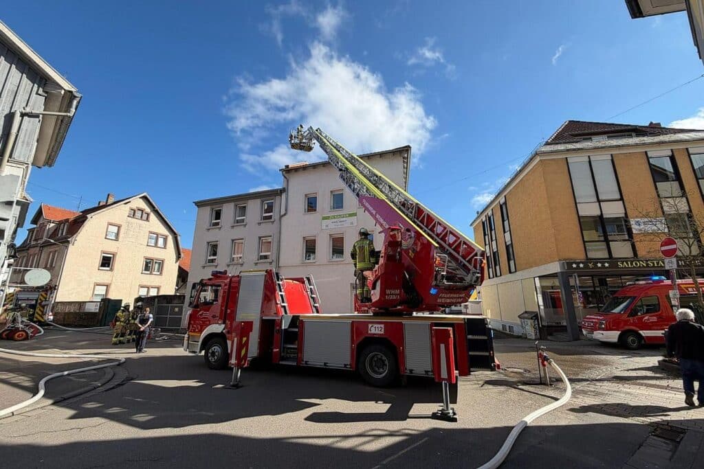 | Bildhinweis: | Die Drehleiter der Feuerwehr Weinheim wurde zur Kontrolle des Dachbereichs eingesetzt (Archiv), Feuerwehr Weinheim via |
