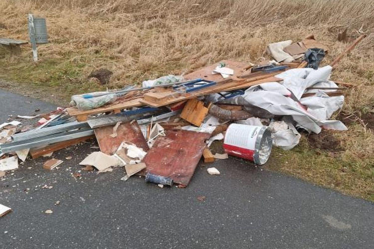 Der Abfall, darunter Rigipsreste, Trockenbauprofile und eine Bierzeltgarnitur, wurde am Bahnseitenweg kurz vor der Kläranlage abgekippt.